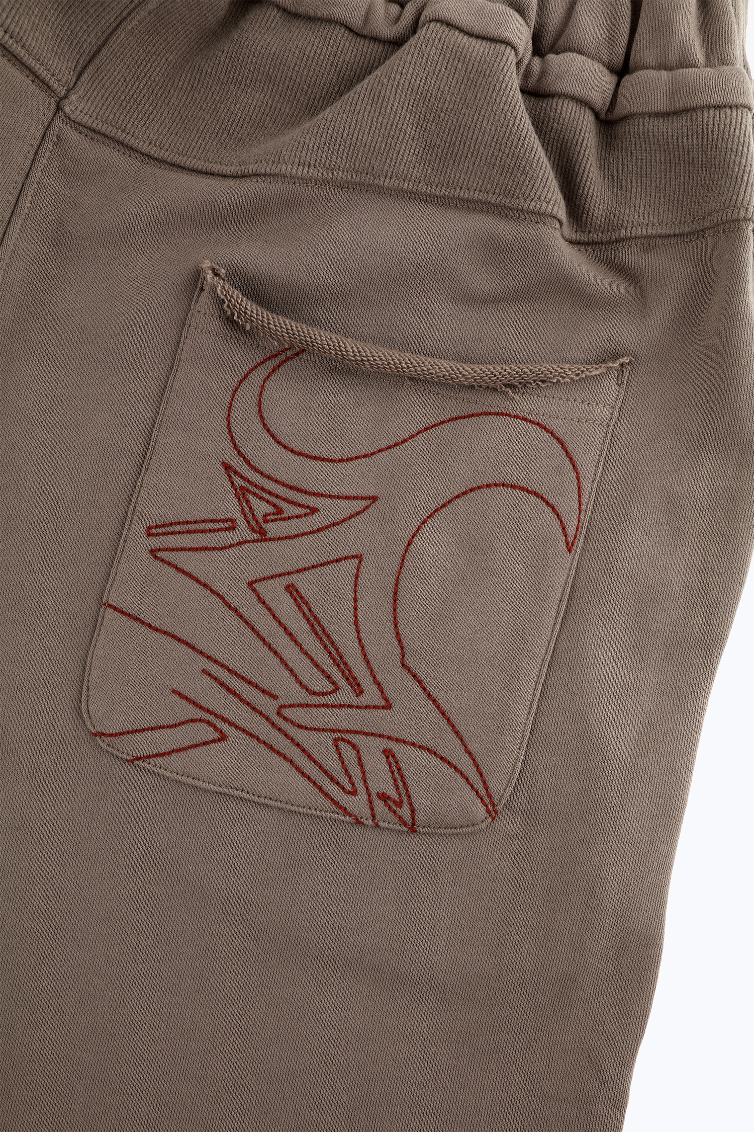 At the back, contrast-fabric patch pockets feature bold Y2K-style curved embroidery, resembling symbols from an underground code—a visual language only insiders can read.